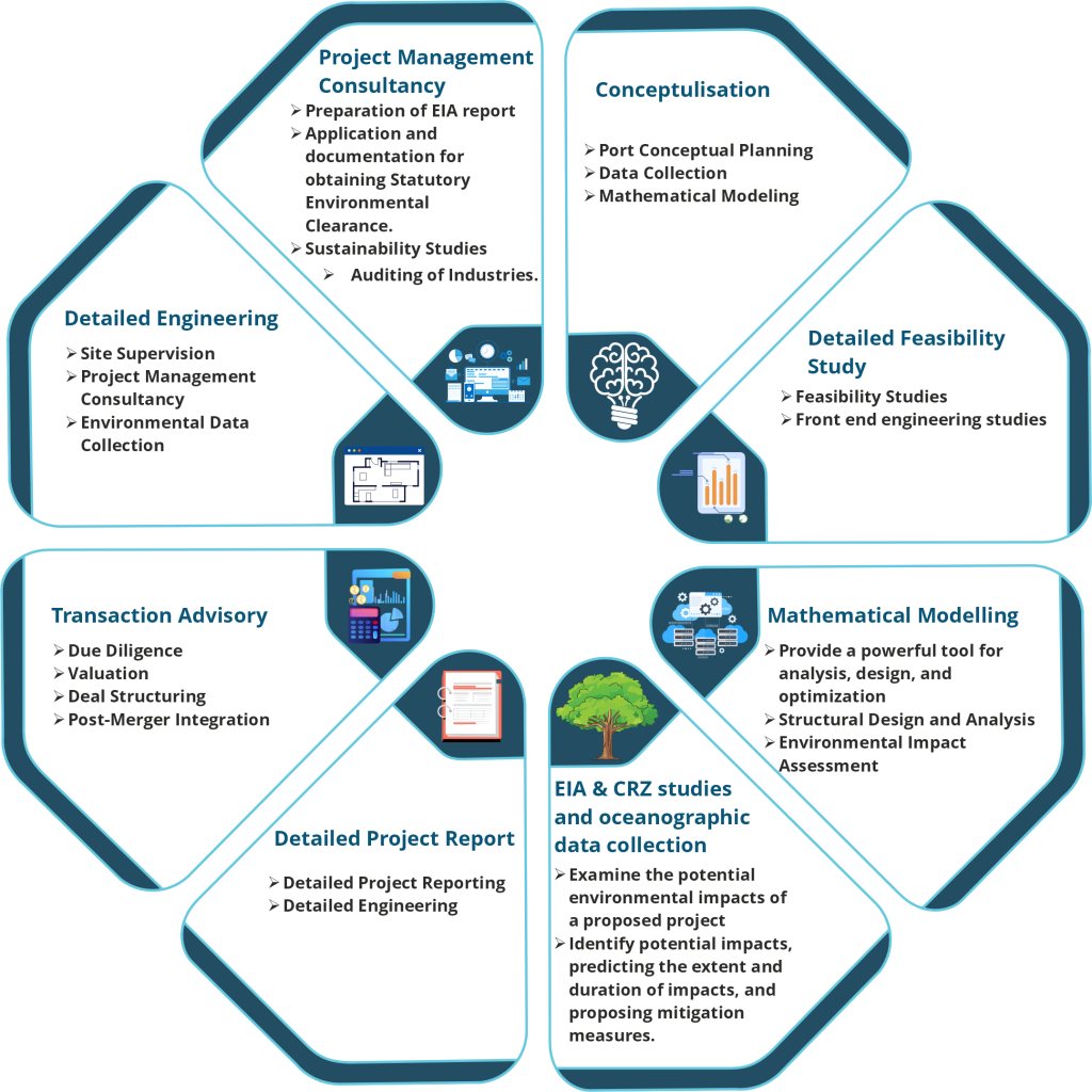 – Port conceptual planning, data collection, mathematical modelling, feasibility studies, front end engineering studies, detailed project reporting and detailed engineering.